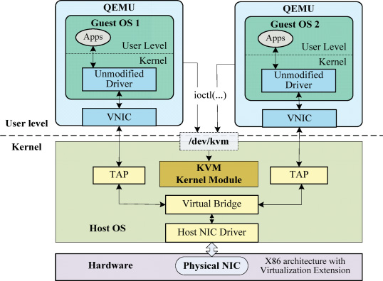 위에서 언급했듯이, 일반적인 가상화 시스템에서 물리 NIC과 연결되어 통신하기 위해서는 여러 레이어를 통해야합니다.