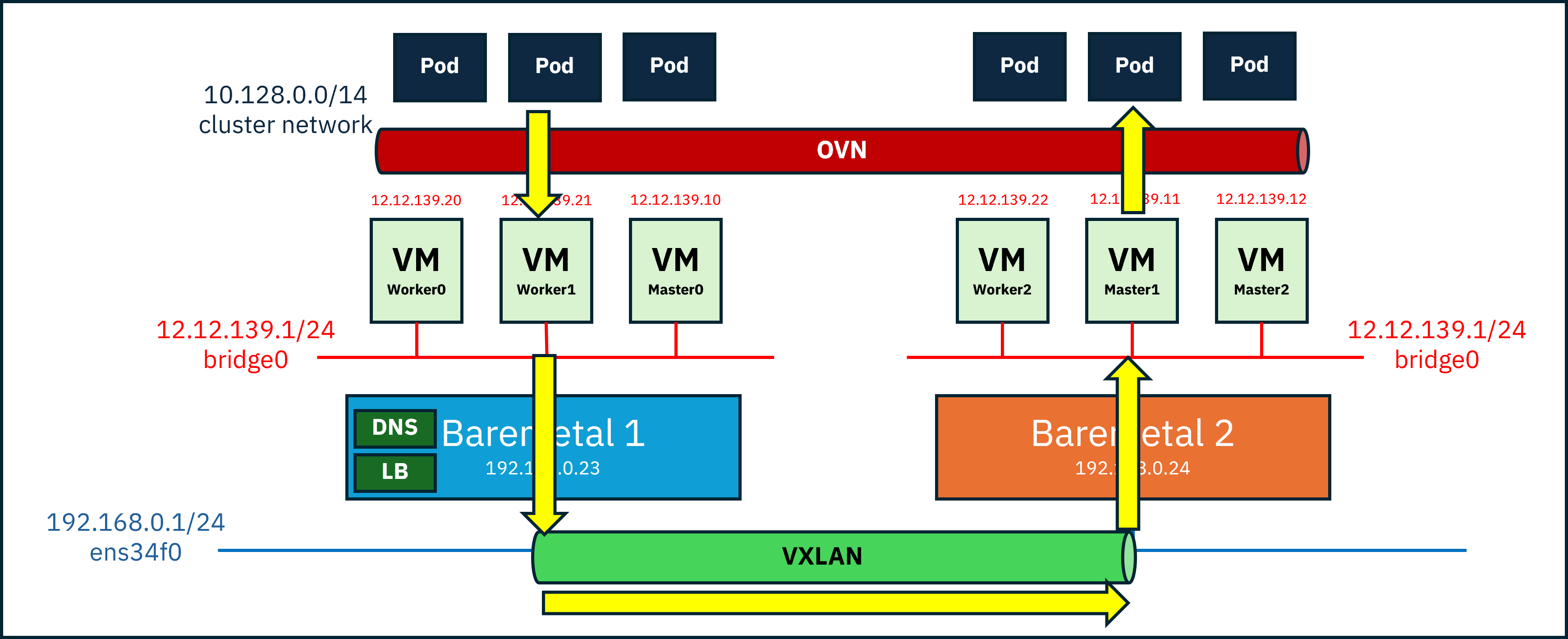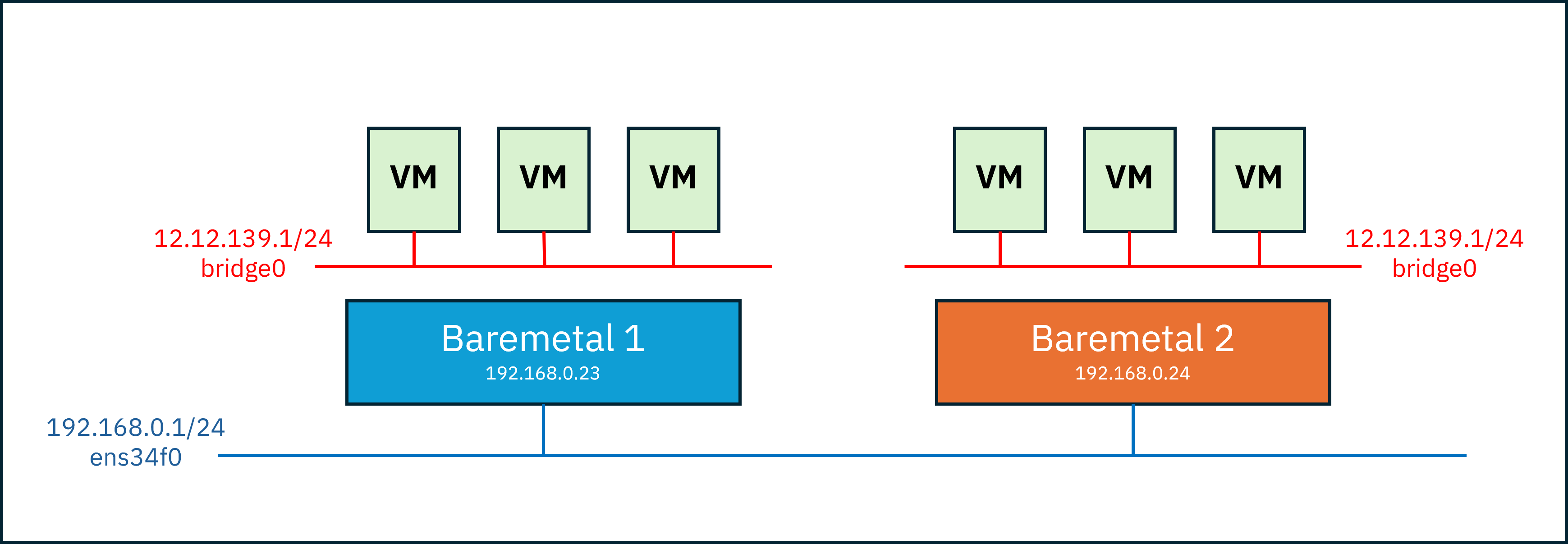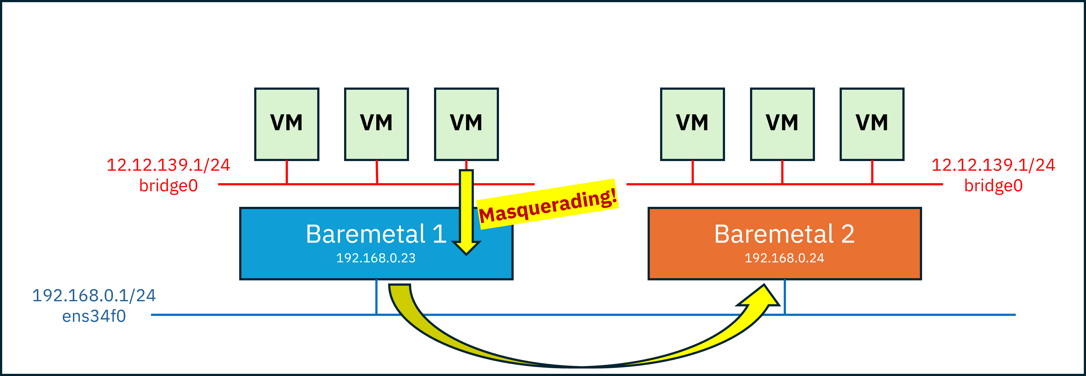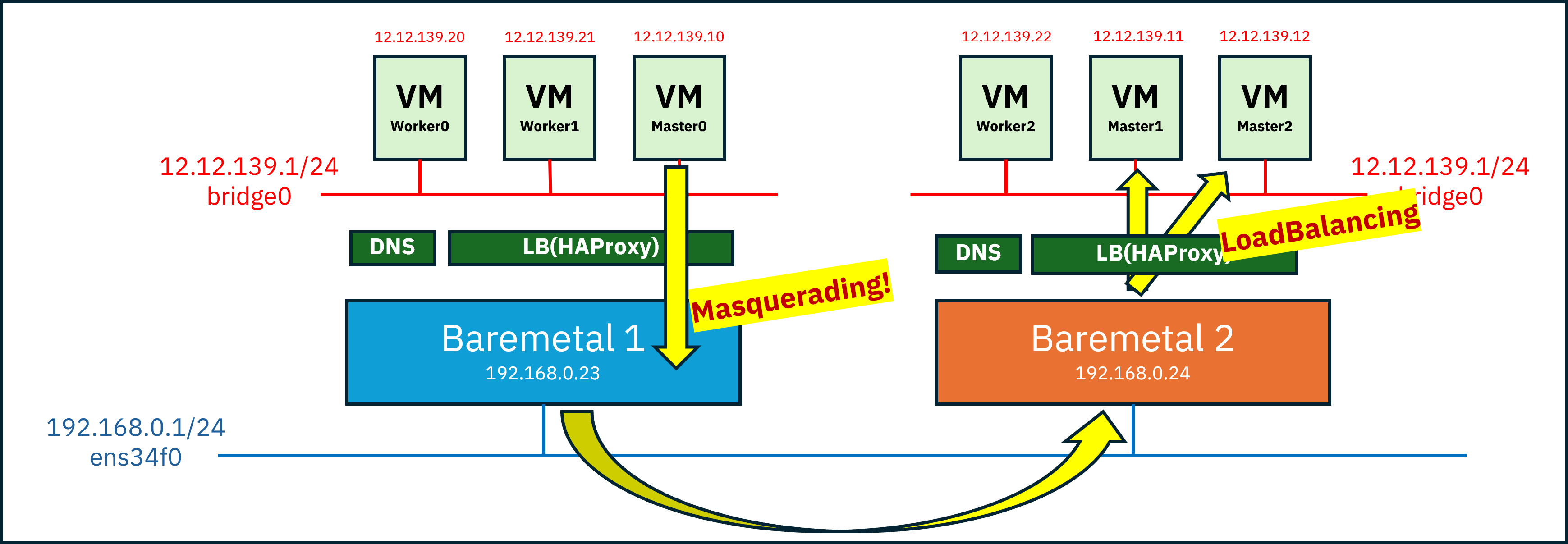 직접 Master0(Baremetal 1) -> Master2(Baremetal 2)의 ip를 호출할 수 있게, 즉 한 vm에서 다른 호스트에 있는 vm을 직접 호출할 수 있게 만들어줘야 했습니다.